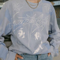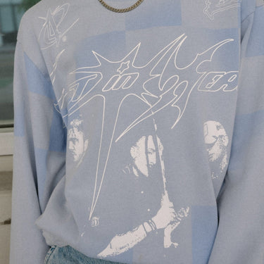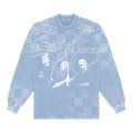 Fully custom light blue longsleeve with a subtle all-over faded checkered pattern. This premium 100% cotton top is finished with a photo collage of Chase Atlantic and bold puff print graphics across the chest. Designed with a relaxed fit and ribbed cuffs, blending comfort with an elevated streetwear style.