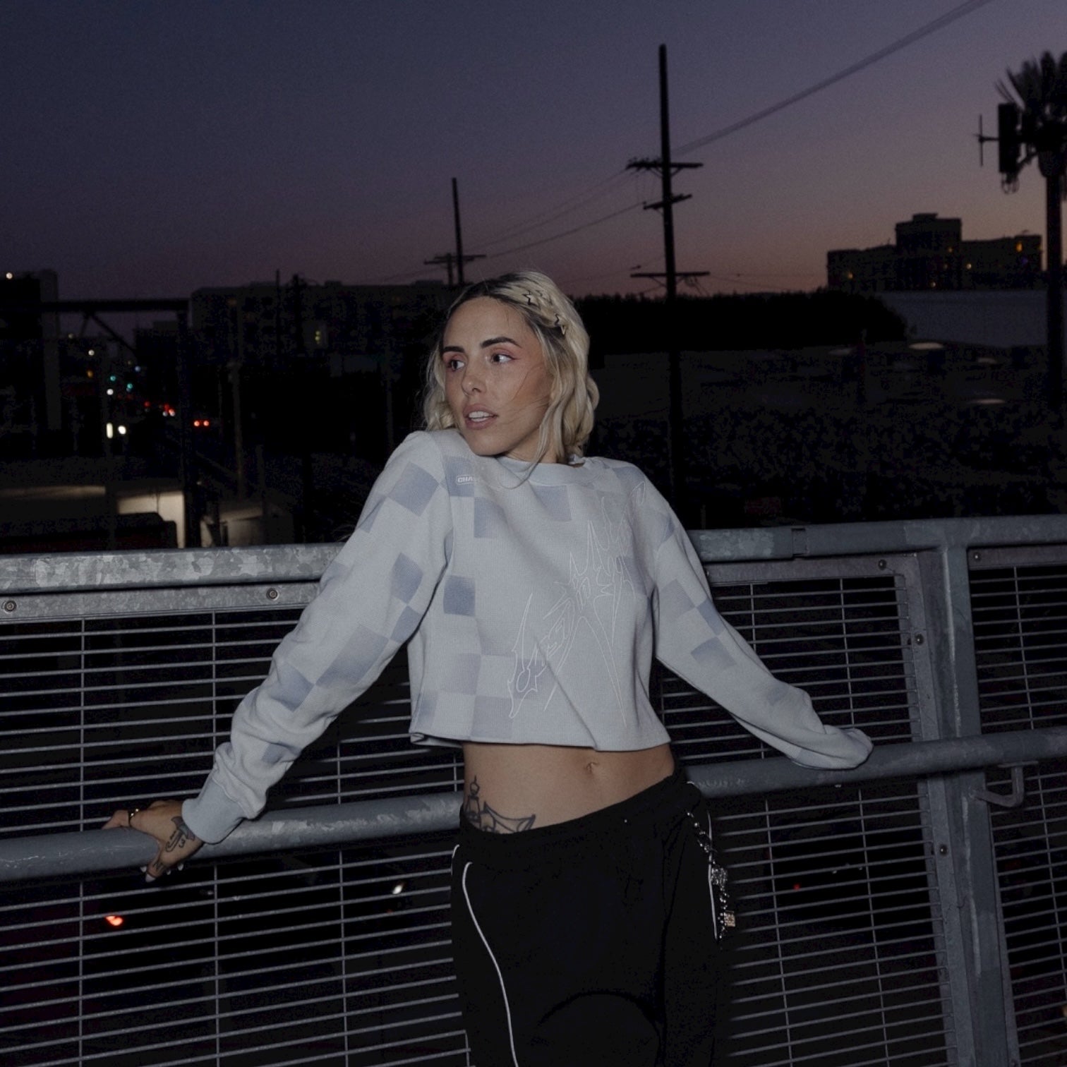 Fully custom light blue women’s long sleeve designed with a relaxed fit and cropped cut. This premium 100% cotton top features a subtle all-over faded checkered pattern with puff print graphics across the chest and sleeve.